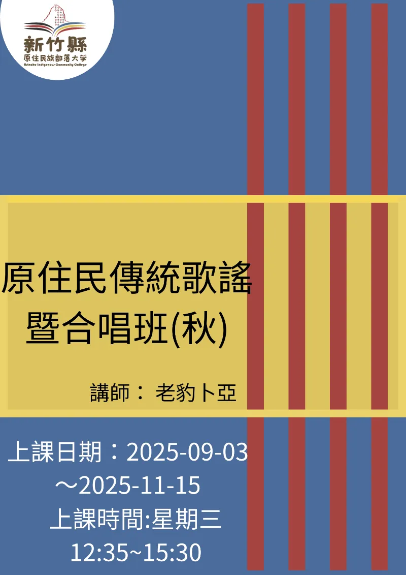 本課程為歌謠文化初階班,期待傳承歌謠完化之精髓以未來製作光碟專輯為目標期待傳承部落歌謠及文化課程