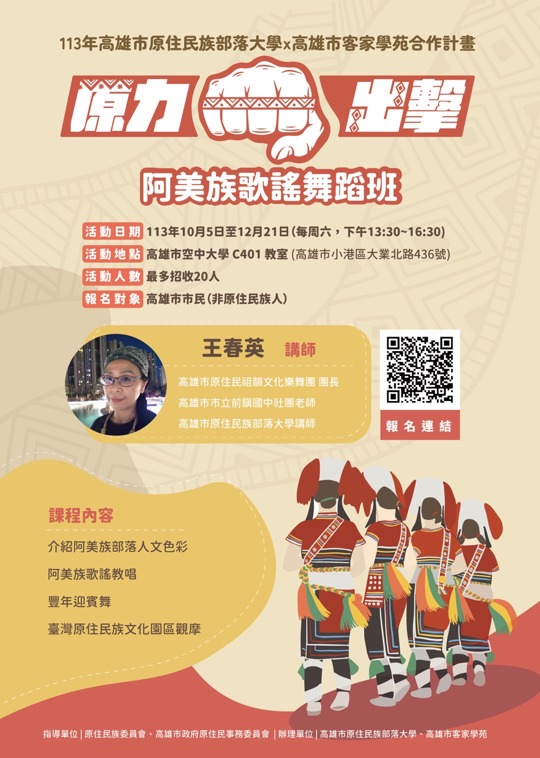 為落實及推動全民原教,由高雄市原住民族部落大學及高雄市政府客家學苑合作辦理【原力出擊系列課程-阿美族歌謠舞蹈班】,邀請本市原住民族部落大學師資授課,讓本市市民有機會認識及接觸原住民族文化與學習,絕對不要錯過,限額20名,有興趣的朋友們不要猶豫,報名就對了!!!!