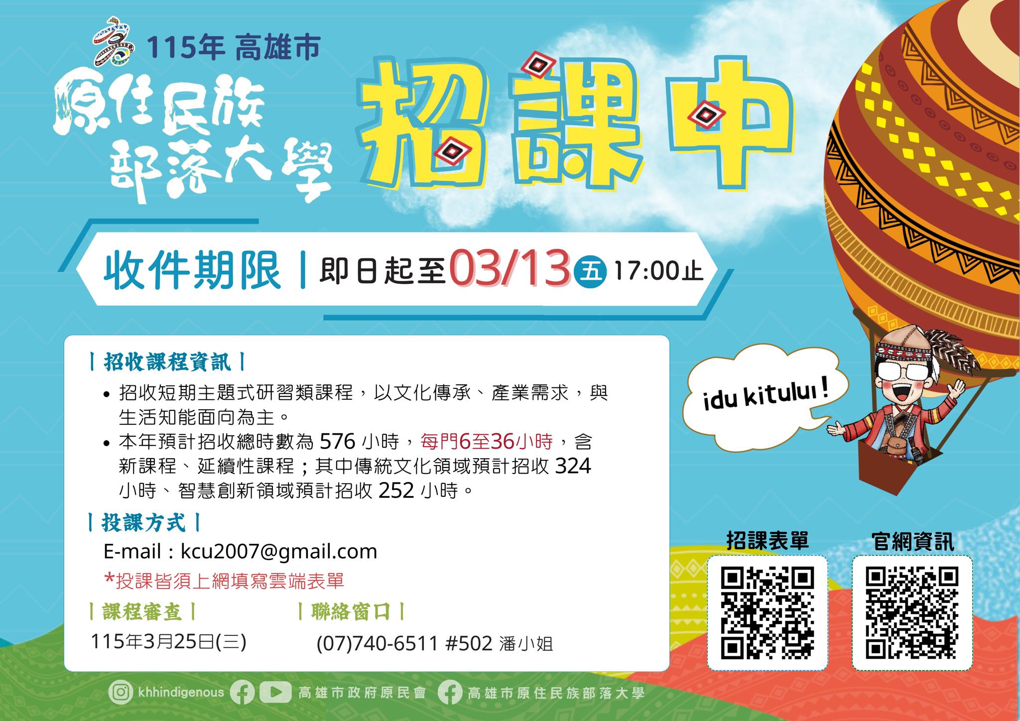 一、高雄市原住民族部落大學自即日起至115年3月13日(星期五)下午5點止,招收115年研習類課程。