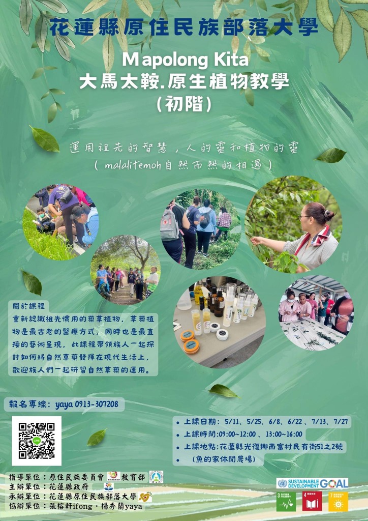 你知道嗎?阿美族傳統保健藥草是台灣的寶藏!現在就來參加mapolong Kita原鄉.原生植物教學,探索這些寶貴的植物智慧吧! 深入認識阿美族常見的藥草植物,學習它們的特性、作用與傳統運用。不僅如此,還將融入部落文化與地方特色,一起製作當季的保健、保養藥草商品,讓你親手感受到這些古老智慧的力量! 課程特色: 深入了解阿美族傳統保健藥草,掌握超過40種當季常見植物。 學習辨識、採集、栽培並製作在地特色的保健、保養商品。 借助部落耆老的智慧,透過質性訪談及影音紀錄,將傳統知識傳承與保存。 課程內容: 集中教學:由講師介紹常見藥草植物的特性與應用價值,現場辨識與操做,讓你從中學並實際操作。 與部落傳統酒麴達人連結,利用傳統植物創作保健商品,傳承長者智慧。 從課程中認識馬太鞍、馬佛部落周邊的植物藥草,並製作當地特色保健產品。 課程目標: 認識40種以上當季部落傳統保健食材與常見草藥,瞭解其效用與應用。 掌握辨識、採集、栽培並製作在地特色的保健、保養商品的技能。 提升對部落傳統保健食材與常見草藥的認知,研發並運用藥草屬性調配保健用品。 不僅學習,更是一場對傳統智慧的探索與傳承!快來加入我們,一起啟航探索阿美族的保健之道吧! 日期:5/11、5/25、6/8、6/22、7/13、7/27 時間:上午9:00-12:00;下午13:00-16:00 地點:光復鄉西富村民有街51-2號(魚的家休閒農場)
