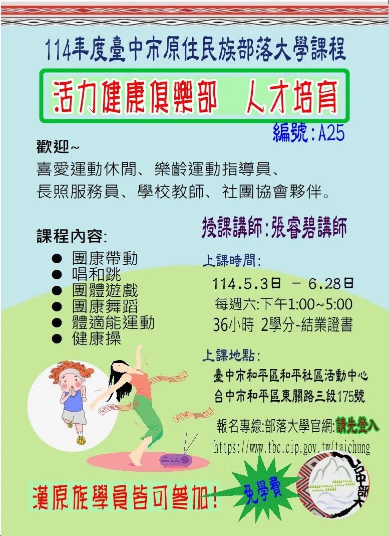 融合團康性質的體適能活動、唱跳、健康舞蹈、團體遊戲、音樂遊戲,健康操等,運用多元教材與原住民文化元素的結合成酵素,設計生動活潑創意教學課程。實踐個人及促進各年齡層與族群健康的福祉,讓我們攜手為全民幸福努力!