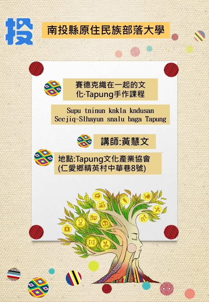 廬山是賽德克部落,編織技藝是賽德克族珍貴的文化傳承,曾是族人生活中的重要一環,承載著深厚的歷史與智慧,隨著時代變遷,機器的取代,年輕一代對傳統文化的認識也日漸薄弱,因此,規劃這門課程,旨在讓部落青年透過實作學習,重新認識傳承的重要性,並在課程中結合現代創新設計,創作出日常生活中實用的文創產品,讓傳統工藝能夠融入現代生活,課程是技藝的學習,更透過記錄耆老口述的歷史故事,加深學員對文化背景的理解,並將故事成為部落文化的珍貴資源,期望透過學習的過程,培養出具備工藝技能與文化認同的部落年輕人,推動部落工藝人才的發展,同時發展具有市場潛力的文創商品,推動文化導覽與產業發展,實現部落經濟與文化的永續發展。