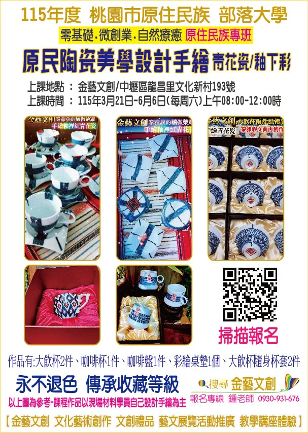 本課程旨為原住民族文化圖騰與台灣鶯歌陶瓷(青花瓷/釉下彩)工藝結合。透過系統性的純手繪教學,從法制面(傳智條例)到技術面(構圖、調色、燒製),帶領學員完成具個人原民特色的藝術文創商品。課程末端導入數位攝影與行銷品牌觀念,協助族人將傳統技藝轉化為文化產業動能。