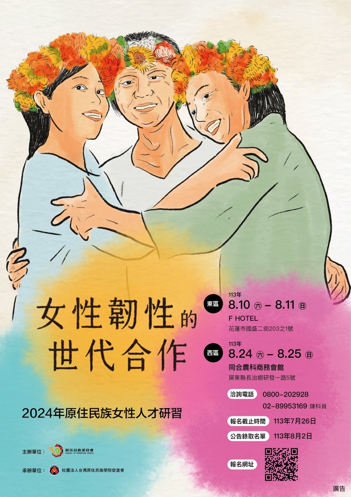 「2024年原住民族女性人才研習」共辦理東西區兩場次,每場次各遴選30名學員,即日起開放符合線上報名,資訊如下: