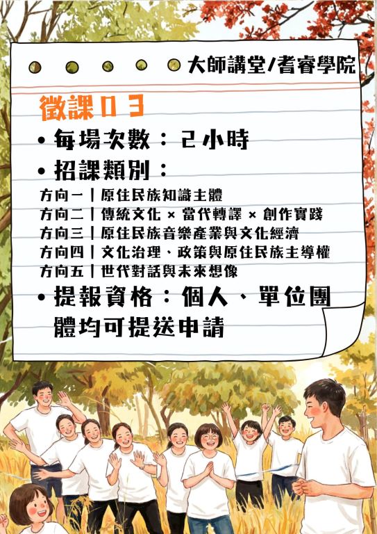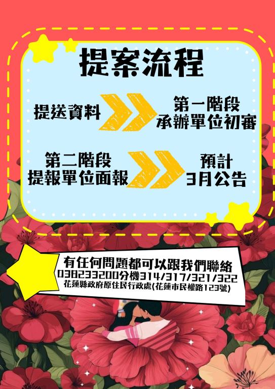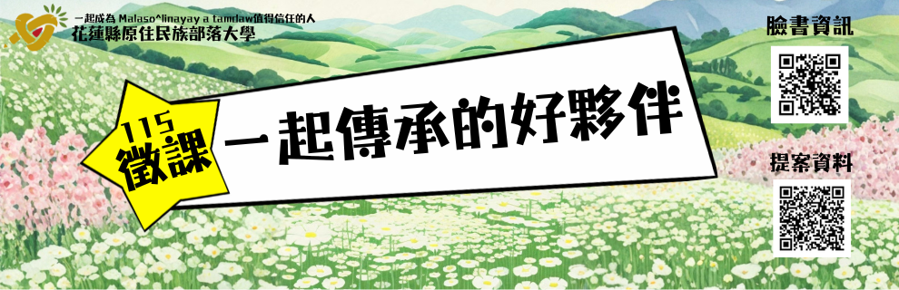 二、提報資格 凡具備相關專業或實務經驗之個人、團體、工作室或單位,皆可提出課程申請。 三、徵集期間 即日起至 115 年 2 月 2 日(星期一)止。 四、提案流程 線上提報 → 資料送件 → 承辦單位初審 → 面報審查 → 預計 3 月公告審查結果。 線上提報網址:https://reurl.cc/MMg7e4 詳細徵課資訊請參閱圖卡 QR Code。 五、洽詢方式 花蓮縣原住民族部落大學 承辦窗口 電話:03-823-3200 分機 314、317、321、322