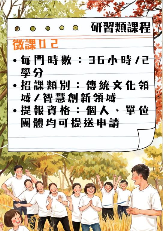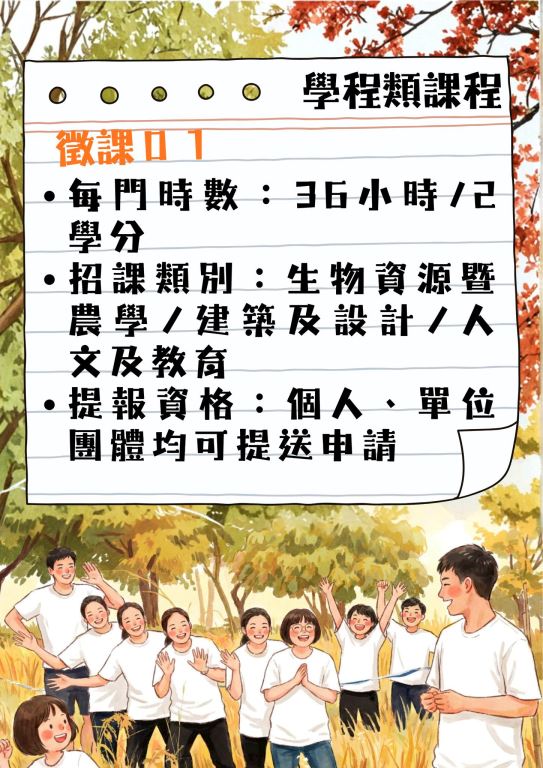 一、課程徵集類型 (一)學程類課程 每門課程 36 小時,核給 2 學分。 招課領域包含:生物資源暨農學、建築及設計、人文及教育等相關領域。 (二)研習類課程 每門課程 36 小時,核給 2 學分。 招課領域包含:傳統文化領域、智慧創新領域等相關主題。 (三)大師講堂/耆睿學院 每場次 2 小時,聚焦以下五大方向: