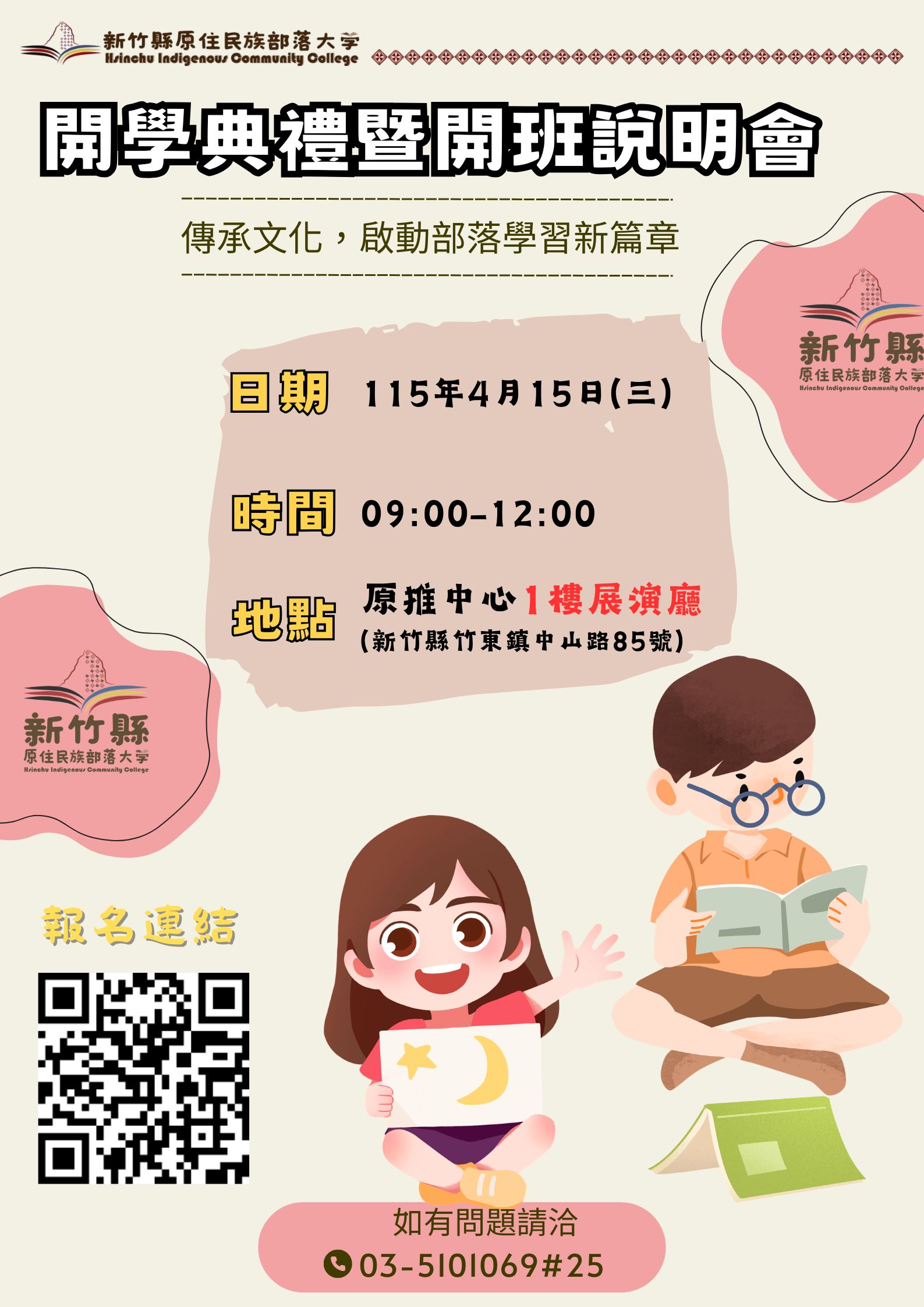 二、開學典禮暨開班說明會 訂於115年4月15日(週三)上午9時舉行,請各班講師及專員務必出席參加。 報名連結:https://forms.gle/PKRPumjXGw8L6KUq9 (如需申請公假者,請於4月6日前完成回覆)