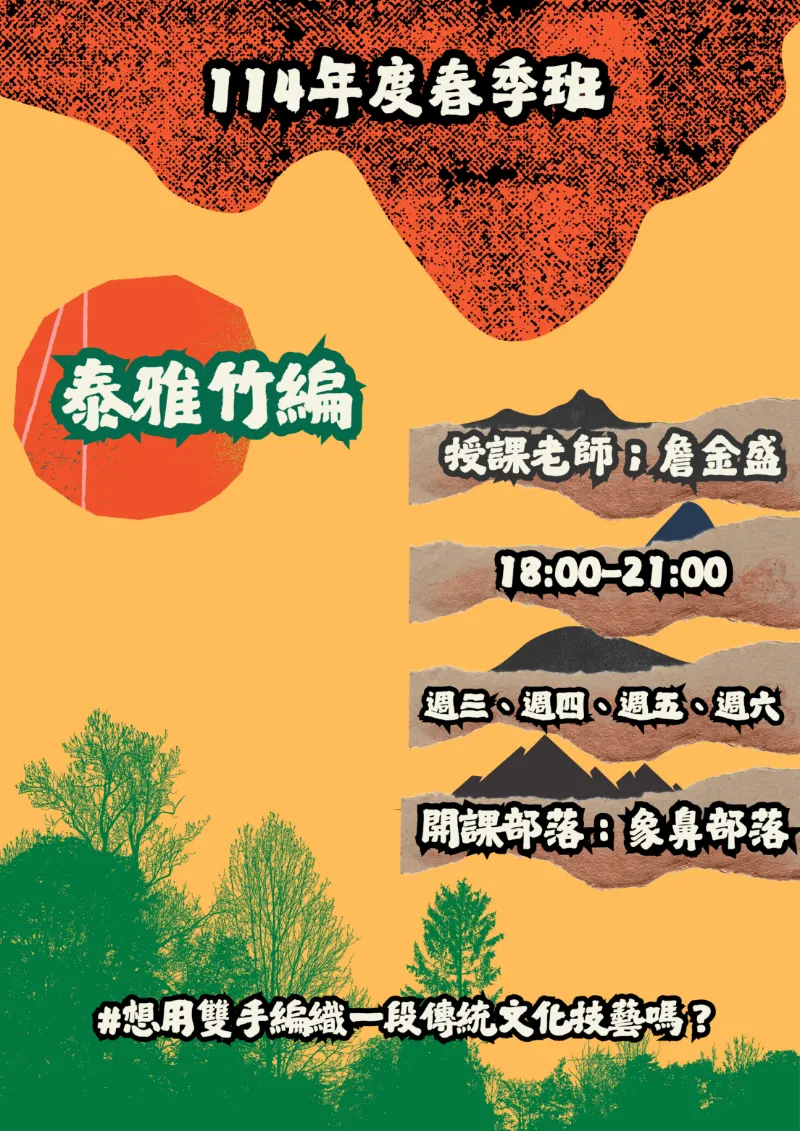 1.編織籮筐、竹篾等農聚及民生用品為主、體驗、實地實作等相關課程。 2.竹編研習:竹編研習,保有編製泰雅農作品的觀念。 3.另類鼓舞作用:在好還要更好的思維角度,利用正面的數據呈現,確實可以激勵起社區居民,更愛護、保護周遭生態完整的心態。