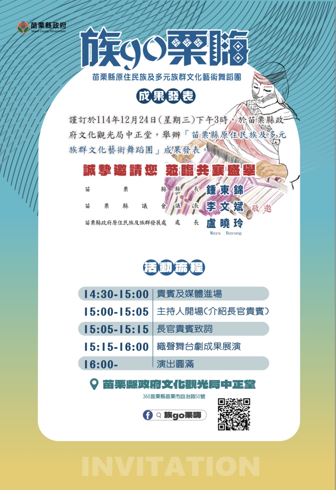 📌 演出資訊: ✍️日期: 114年12月24日 (星期三) ✍️時間: 14:30 開放入場;15:00 正式展演 ✍️地點: 苗栗縣政府文化觀光局中正堂