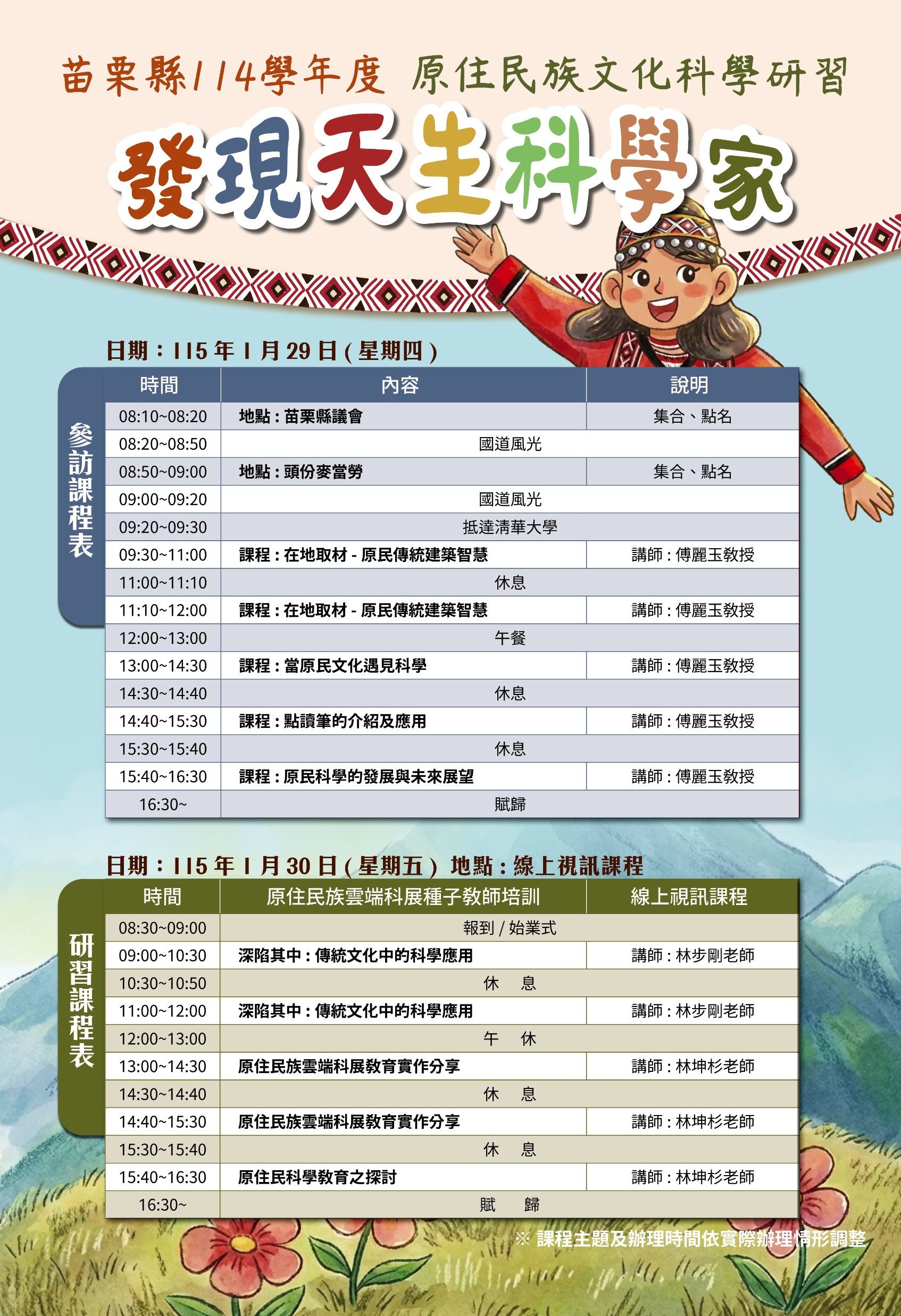 苗栗縣原住民族教育資源中心114年度「發現天生科學家」原住民族文化科學研習 ♦️依據: 一、 依據原住民族教育法第19條及「教育部國民及學前教育署補助辦理原住民族教育要點」辦理。 二、 教育部國民及學前教育署(下稱國教署)114年4月18日臺教國署原字第1145701155號函辦理。 三、 苗栗縣政府114年4月21日府教務字第1140082423號函辦理。 ♦️目的: 一、配合《原住民族教育法》、《12年國教課綱》鼓勵協助中小學教師進行臺灣原住民族科 學素養教育之相關教材教法研發工作。 二、以原住民族部落中傳統耆老智慧、自然知識、生態保育以及現代科學科技創新的資源,引 導現職教師學習原住民族群的文化與生活智慧,培養多元文化教育的能力與素養。 三、提升社會大眾對原住民族文化、生態環境與傳統生活智慧的瞭解 ,促進族群文化的交流 與互相尊重,共同致力推動並落實全民原教的重要性。 ♦️辦理單位: 一、 指導單位:教育部國民及學前教育署、原住民族委員會 二、 主辦單位:苗栗縣政府〈原住民族教育資源中心〉 三、 承辦單位:蓬萊國小、清安國小 四、 協辦單位:苗栗縣原住民族教育輔導團、國立清華大學原住民族科學發展中心、苗栗縣政府原住民族部落大學 ♦️一、 活動日期:115年1月29日、115年1月30日 ♦️二、 活動地點:國立清華大學原住民族科學發展中心 ♦️實施對象: 一、 苗栗縣各國中小教師(自然領域教師)。 二、 苗栗縣原住民重點學校教師。 三、 苗栗縣原住民籍教師。 四、 對本計畫有興趣之教師 ♦️相關內容: 一、 報名方式:線上報名: https://forms.gle/SdQy3KbosDto22iF7 二、 報名人數:40人。 三、 連絡電話:037-823385分機13,蓬萊國小總務處風少鵬主任。 四、 活動類型多日型:研習共二天,1梯次 總計14小時課程表。五、 報名截止時間:115年1月22日下午16:00止,將依報名順序錄取。 六、 線上視訊研習連結將於確定錄取後傳至報名者電子信箱。 七、課程表如圖 報名相關事宜如有任何疑問,請洽蓬萊國小 風主任037-823385