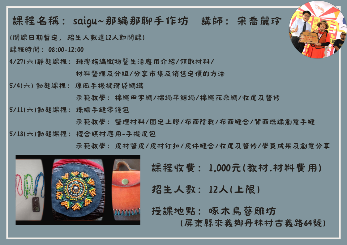 現代人的壓力大,房子的圍牆愈蓋愈高,人與人的距離也愈顯遙遠,在部落中要再廣場看到群聚一起做手工的情景已不復見,我們期待帶給部落一個可以紓壓的環境,一方面也可以學習手作的課程,讓原住民族人可以享受部落的支持,享受族人同儕的溫度,還能在學習上有所成就。