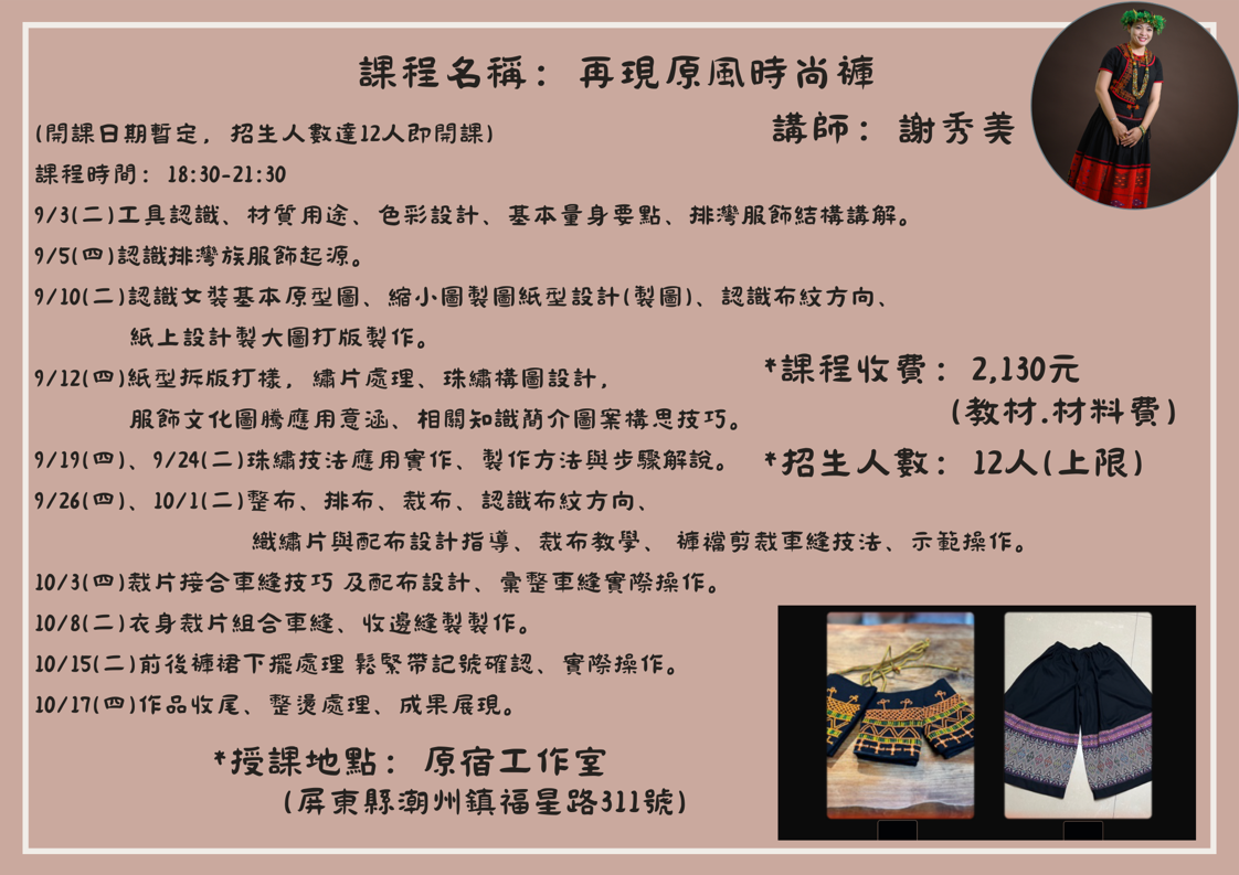本課程除了服裝設計及基本打版外更加入了閃爍的珠繡也混合織繡、圖騰,在部落文化祭典裡排灣族人原服飾中龍袍、寬褲、手套是必配的配件之一,象徵對於文化的傳承與尊重。