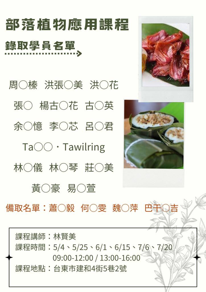這次以部落田園植物作為主要教學,其他植物為輔助,除了一般生活應用外,針對未來部落發展觀光類的民宿或餐飲部分,用部落的植物來分享製作經驗,以利未來社區產業發展。