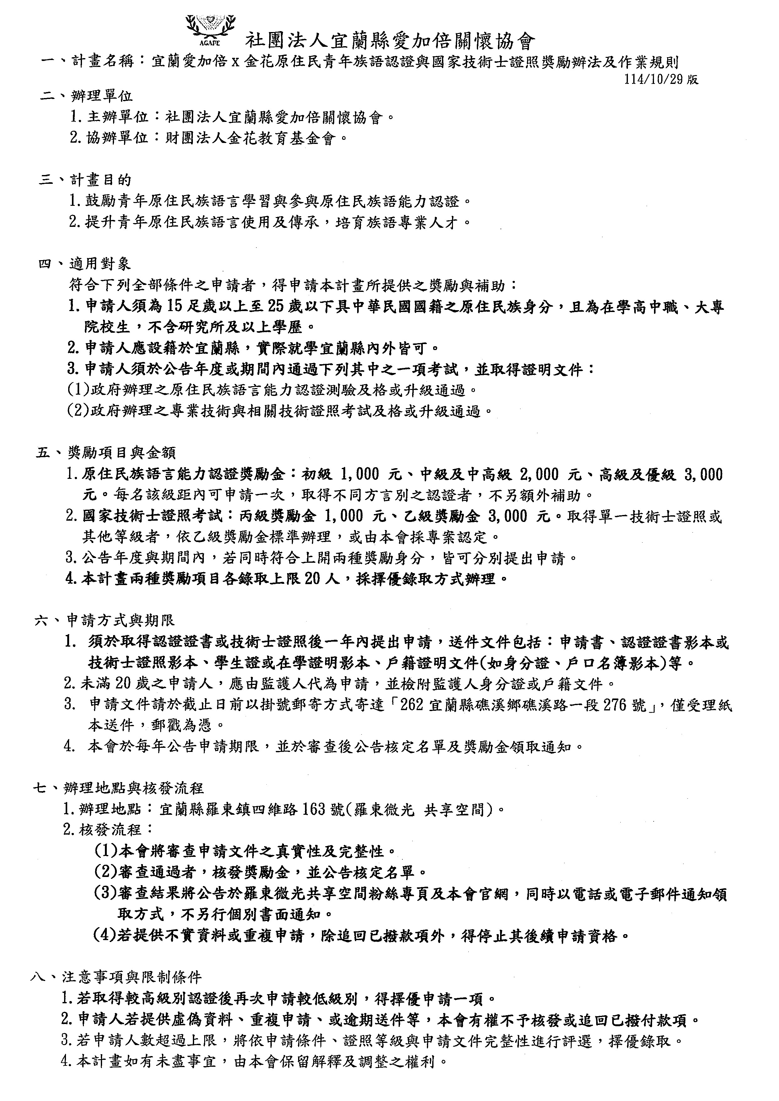 社團法人宜蘭縣愛加倍關懷協會辦理「宜蘭愛加倍x金花原住民青年族語認證與國家技術士證照獎勵辦法(含申請表)」「宜蘭愛加倍x金花原住民青年族語認證與國家技術士證照獎勵辦法簡章(含申請表)」